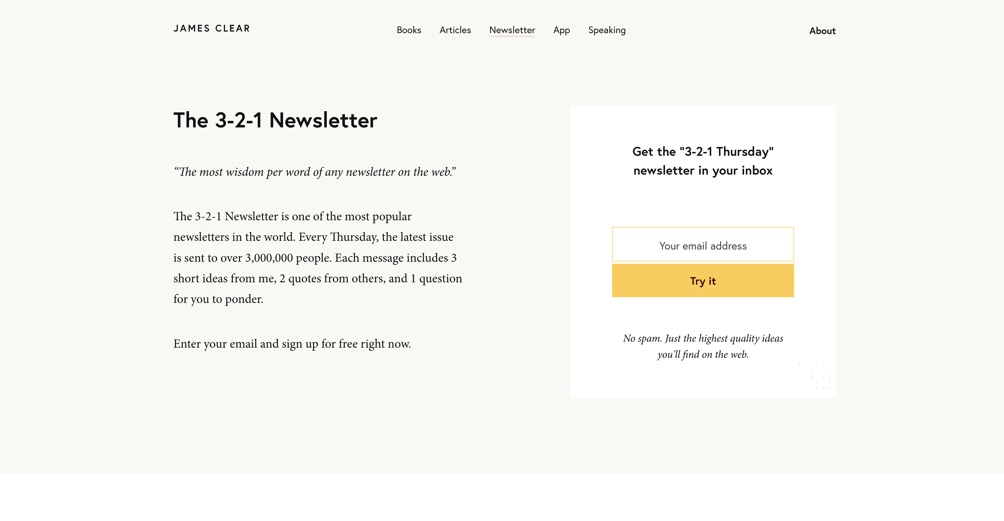 The landing page for James Clear’s 3-2-1 Thursday is a masterclass in conversion rate optimisation (CRO). It is famously minimal, removing every possible distraction to focus on a single action: signing up.